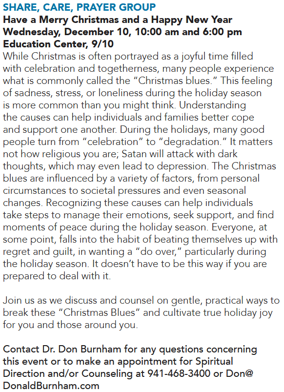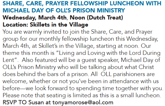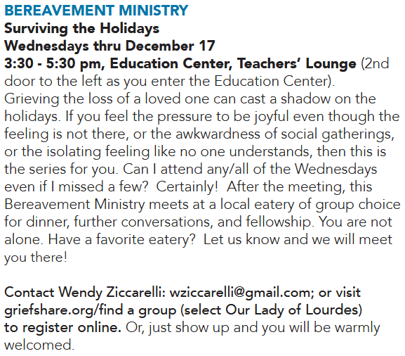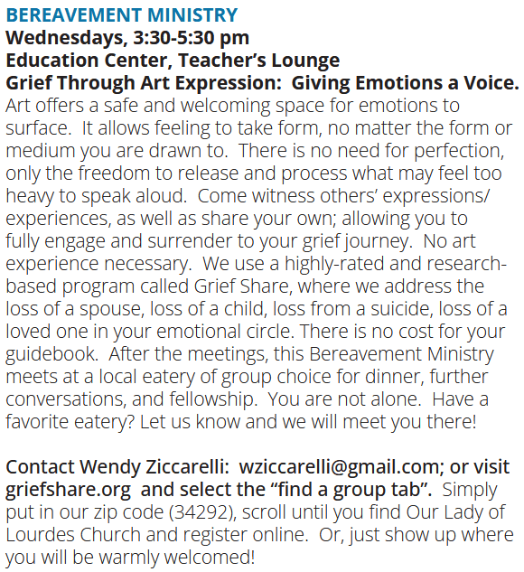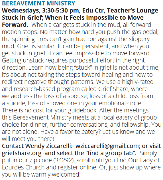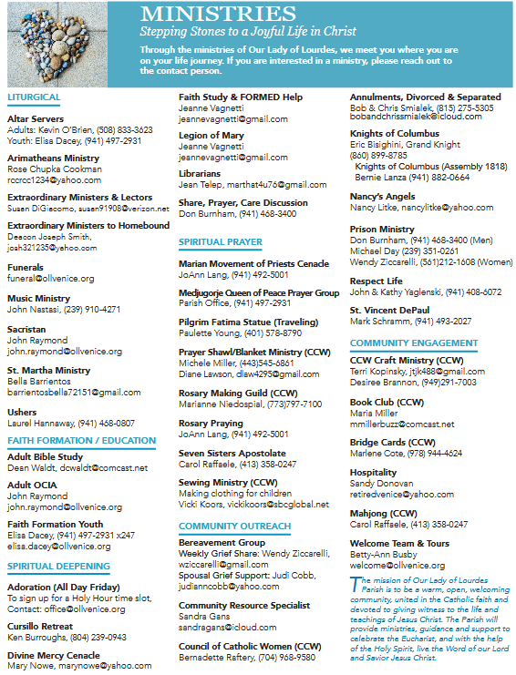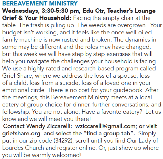 To get involved in this ministry at Our Lady of Lourdes please contact John and Kathy Yaglenski at 941-408-7558 or kathy@yaglenski.com