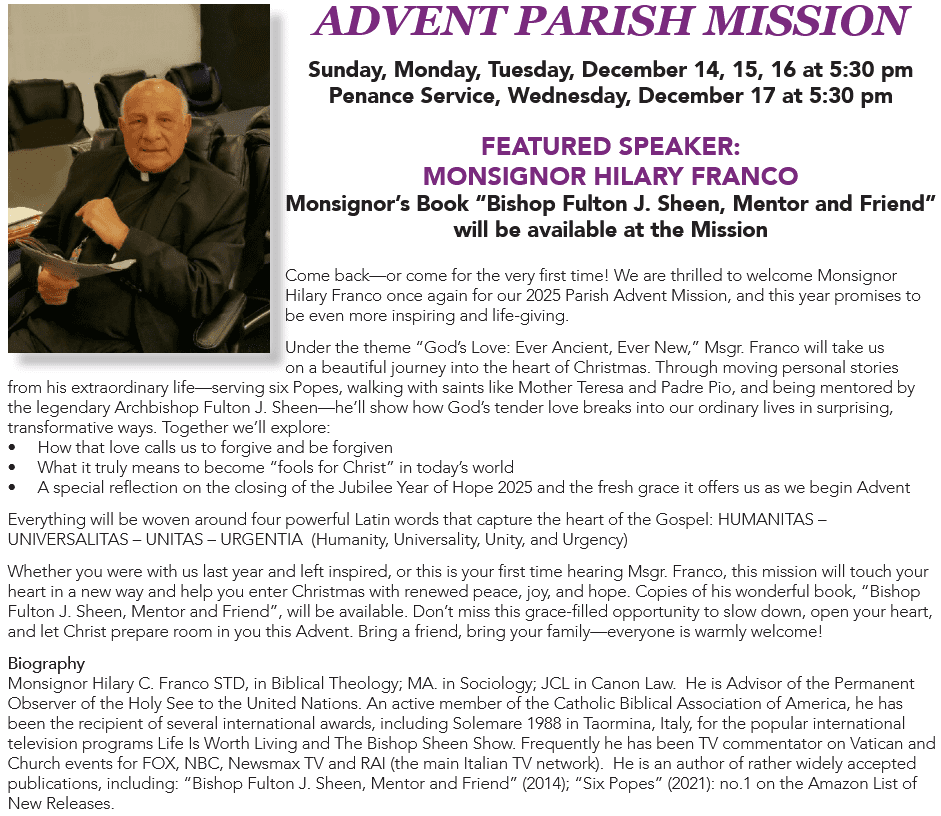 Please consider joining Mary’s Army. We are the largest Catholic lay organization in the World. Our Apostolate at Our Lady of Lourdes is looking for active male and female members (2 hour commitment per week) and Auxiliary members (Rosary Warriors to pray the rosary daily).
